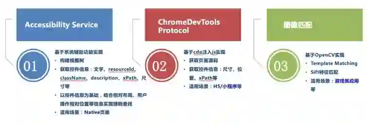 第二种方案基于 Chrome 的调试协议,通过注入js可以获得页面布局以及各元素属性,控件的定位思路与辅助功能这一套方案是一致的。适用于 H5/小程序场景。