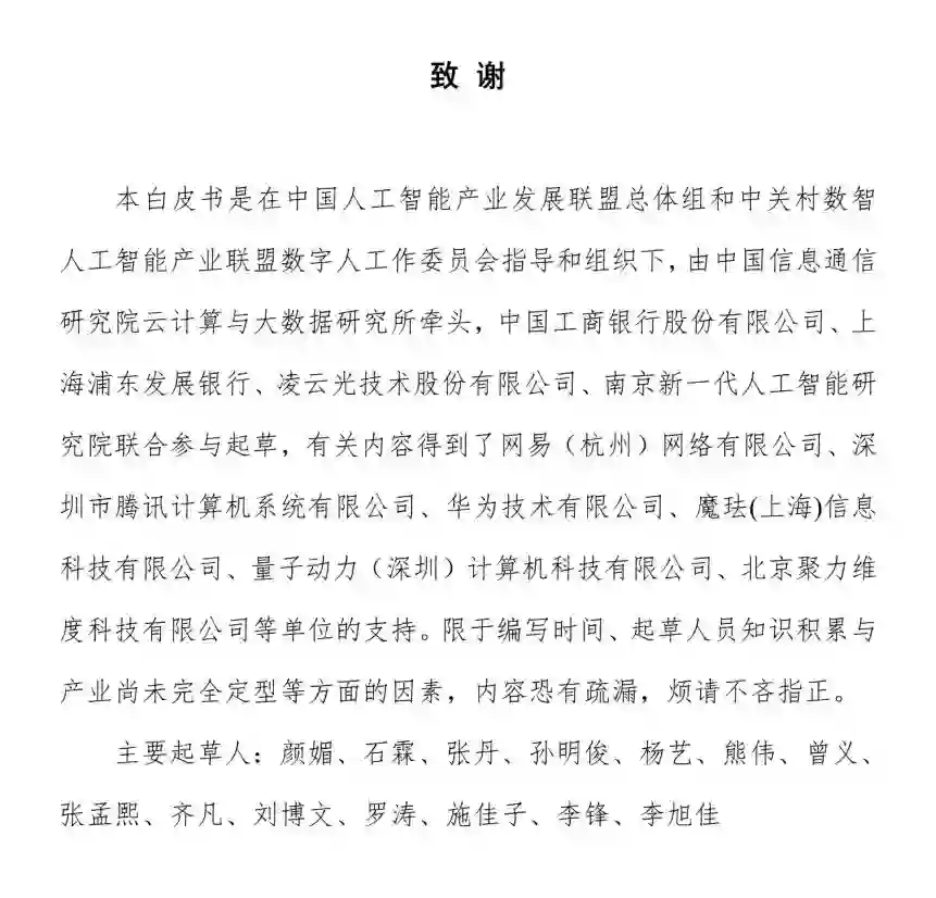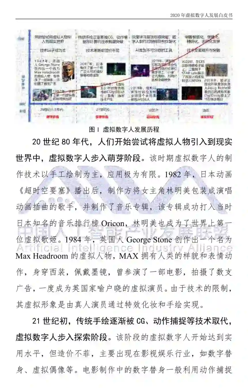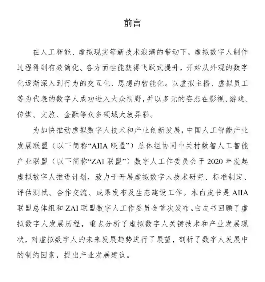 本白皮书是 AIIA│ 联盟总体组和ZAI联盟数字人工作委员会首次发布。白皮书回顾了虚│拟数字人发展历程,重点分析了虚拟数字人关键技术和产业发展现状,对虚拟数字人的未来发展趋势进行了展望,剖析了数字人发展中的制约因素,提出产业发展建议。