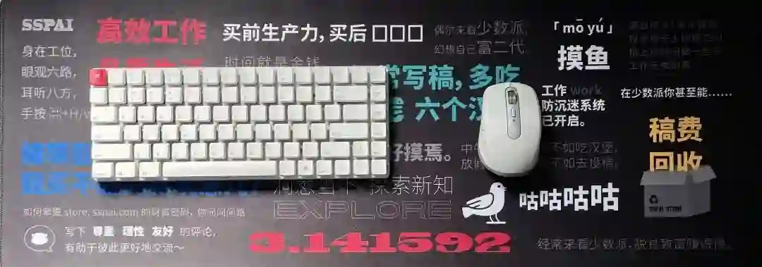 「一派胡言」上收集了一系列与少数派有关的梗。有时低头一瞥,便会被名场面拉走思绪。(不说了去买汉堡了~)背面八字防滑纹路则可以有效防滑,让鼠标垫和桌面紧密相贴。书桌原本不合理的直角设计总会在胳膊上压出一道道印子,鼠标垫的到来也帮我避免了「肌肤之痛」。