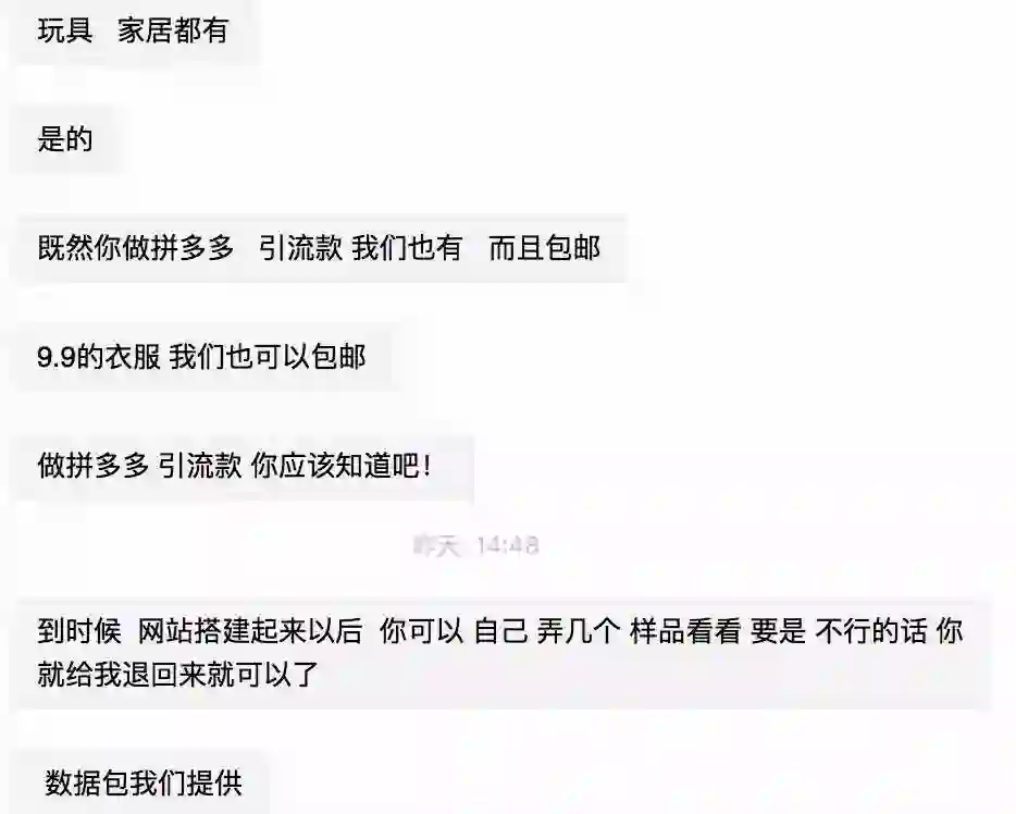 我被小影拉到一个拼多多货源供应的群中,里面多位代理商在推销自己的货源。