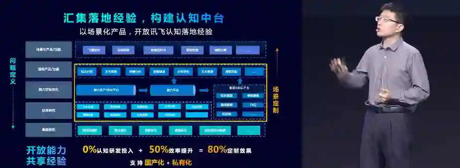 现在,感知智能技术已经较为成熟,但是认知智能才刚刚开始。认知智能不同于感知智能,核心技术只是其中一环,问题定义和持续的迭代优化都很重要,讯飞基于在各个行业积累的丰富经验,构建了行业认知中台,来降低问题定义的难度。