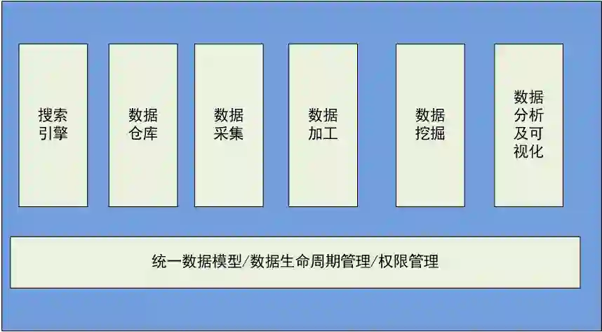 搭建一款集数据采集、存储、搜索、加工、分析为一体的大数据平台,融合结构化数据、非结构化数据,实现了统一数据架构,对海量异构数据的存储归档、信息组织、搜索访问、安全控制、分析可视化,以及数据挖掘、数据治理等,如图1所示。