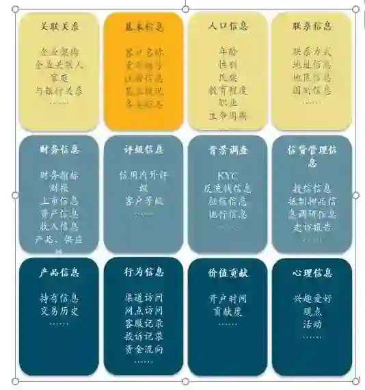 5)决策支持数据:用于决策分析系统、智能化分析系统数据,如客户产品推荐、客户细分、销售预测、精准营销等等。