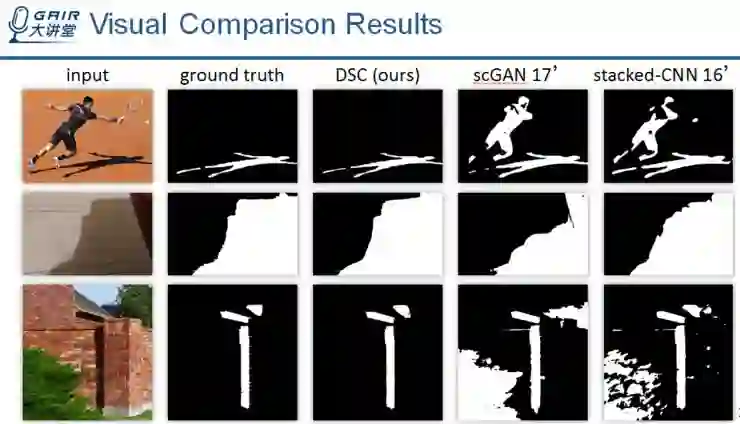 比如,第一幅图拥有许多小的阴影区域;第二幅图拥有一块大的深色区域,然而缺少上下文信息;第三张图主要是 soft shadow,它与非阴影区域的差别不是很大.