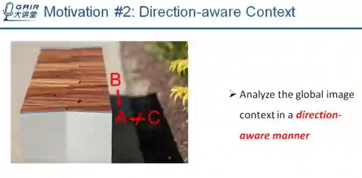 可是当我们去比较 C 区域和 A 区域的时候,我们并不能从 C 区域来判断 A 是不是阴影(C 区域与 A 区域同样都是阴影,且 C 区域更暗)。所以,为了进一步理解阴影,我们提出从不同方向的上下文特征来分析图像。