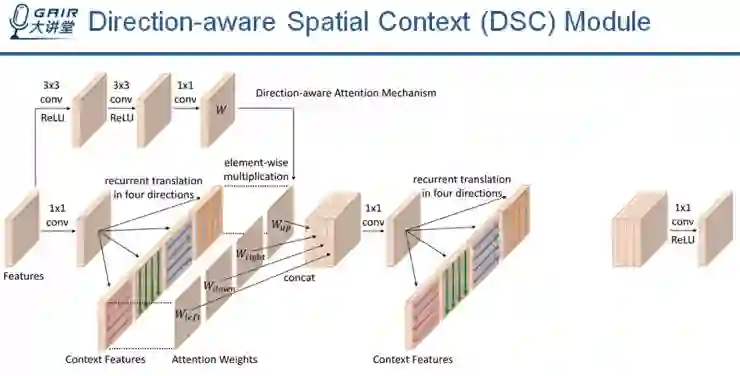 这些权值会在两次 recurrent translation 中共享(且可以跟整个深度学习网络一起进行训练),因此,我们可以通过在不同方向上选择性的使用空间上下文特征来得到 direction-aware spatial context feature,这个结果我们叫做 DSC 特征。