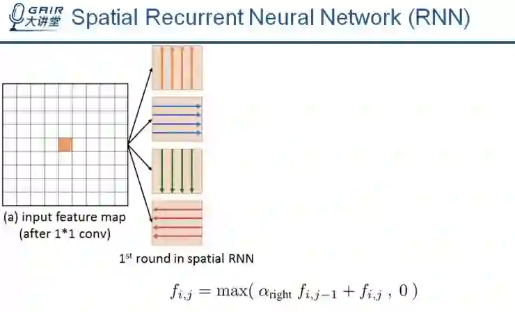 在这个更新的过程中,信息在整张特征图上从左到右传播(公式中的权值 alpha right 是共享的并且可以自动学习的)。通过聚合四个方向的结果,对于每一个像素点来讲,就可以获得它所在的行和列的信息。