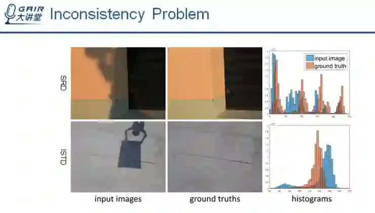 这两张图是分别从 SRD 和 ISTD 两个公开数据集中找的样本,可以从颜色直方图中清楚看到输入图像与 ground truth 之间的偏差。