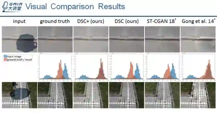 第二行则是:每张图片(红色)与输入图像(蓝色)的颜色直方图对比。可以看到,DSC+可以生成和输入图像颜色与亮度更匹配的结果。而 DSC 以及 ST-CGAN 这些基于深度神经网络的方法,直接用原始的 ground truth 训练,生成的图像与原始的 ground truth 更接近,与输入图像存在颜色偏差。