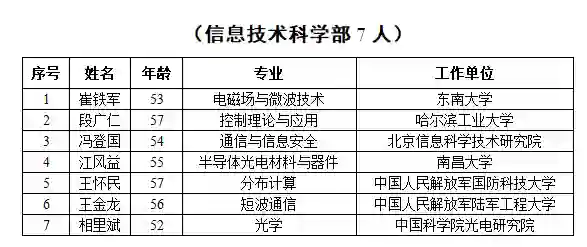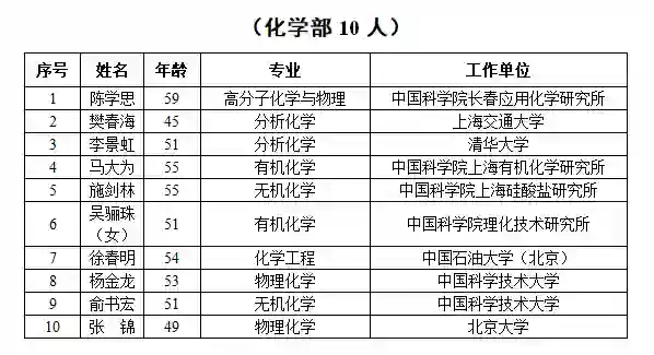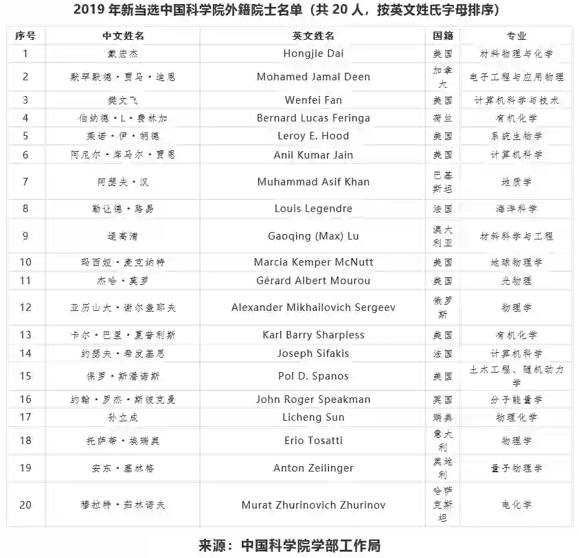 2019年新当选中国科学院院士名单