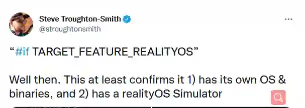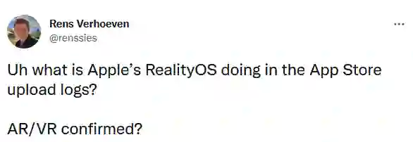 1月17日,iOS开发者Rens Verhoeven在Twitter上曾发文问:“苹果的realityOS在App Store的上传日志是在做VR/AR的技术确认吗?“。另一开发者Steve Troughton-Smith也曾说:“GitHub的repo引用了realityOS,这证实了它有自己的操作系统和二进制文件,并且有一个realityOS模拟器。”他还猜测这可能只是某人从一个假账号上提出拉动请求的记录。