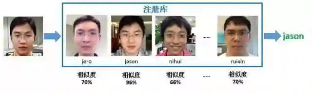 举例说明:人脸识别过程如下,判断结果为输入图像为注册库中的jason