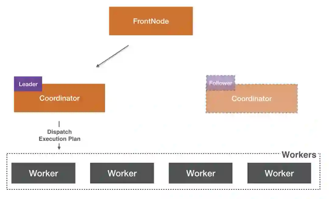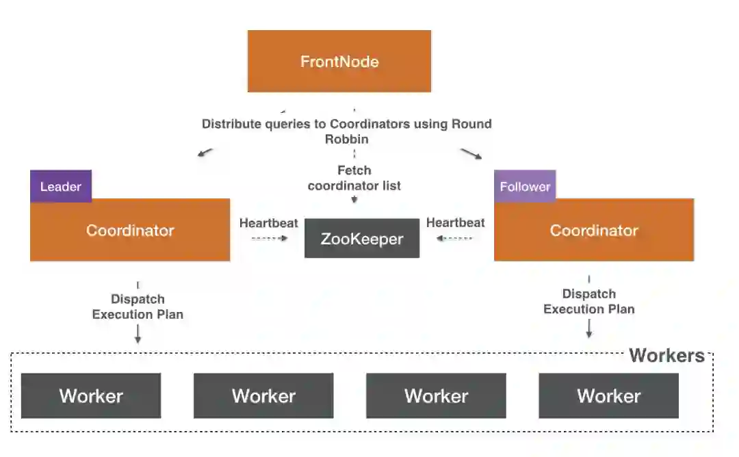 FrontNode在接收到用户的查询之后会把请求按照Round Robin的方式发送给底层的多个Coordinator,这样多个Coordinator就可以分担压力,但是整个集群还是有一些全局的事情要有单个Coordinator来做,比如Presto的Worker状态监控、OOM Killer等等,因此我们引入了一个Zookeeper来做Coordinator选主的事情,选主之后主Coordinator的职责会跟社区的Presto类似:做全局的Worker状态监控、OOM Killer以及执行分配给它的查询;从Coordinator的职责则比较轻量级: 只负责执行分配给它的查询。