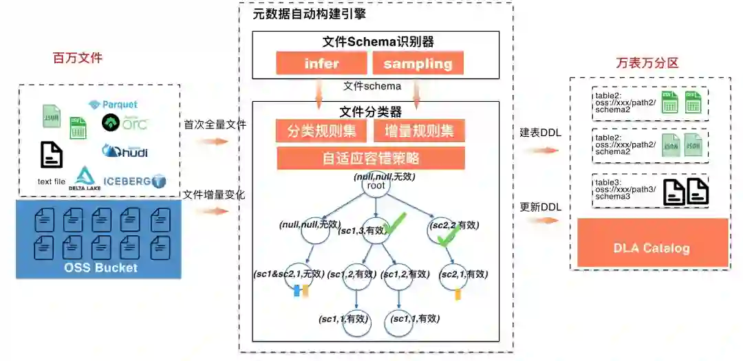 为了高效的为OSS上面的海量数据构建元数据,阿里云DLA提出并实现了“海量文件元数据自动构建技术”。具体技术如下图所示,核心解决了:万表万分区识别、增量感知更新元数据两个问题。