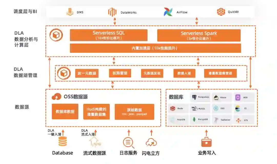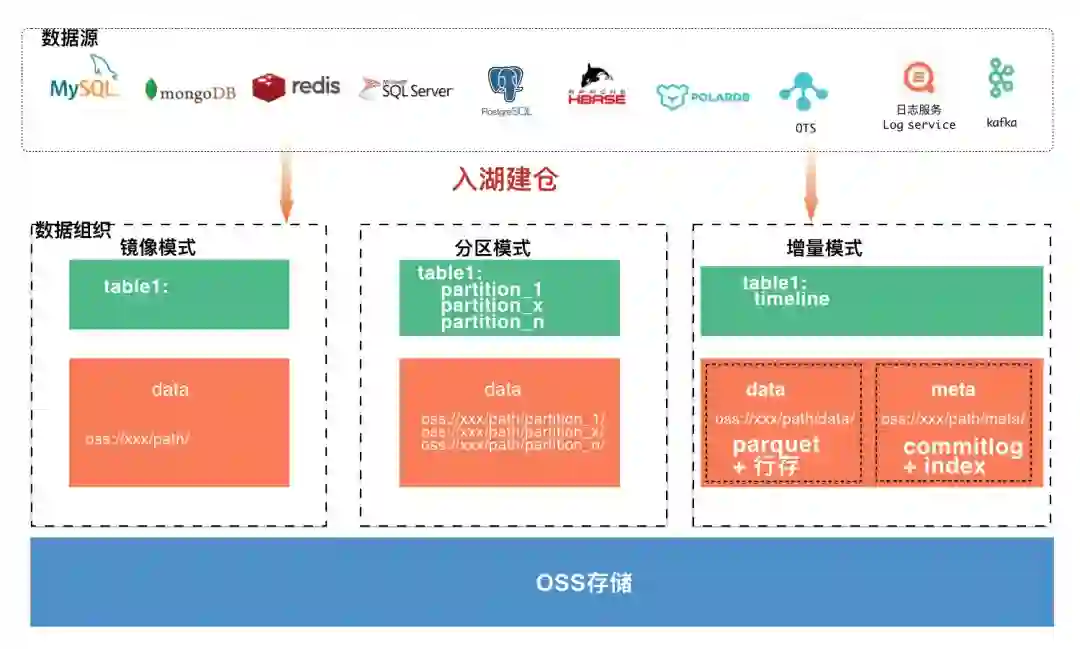 把DataBase及消息日志服务的数据统一存储到数据湖存储OSS进行管理,能够满足计算加速、构建数仓归档、冷热分离等业务需求。DLA的入湖建仓数据组织技术包括三种数据组织管理模式:镜像模式、分区模式、增量模式,三种模式能够搭配友好支持这些业务场景。
