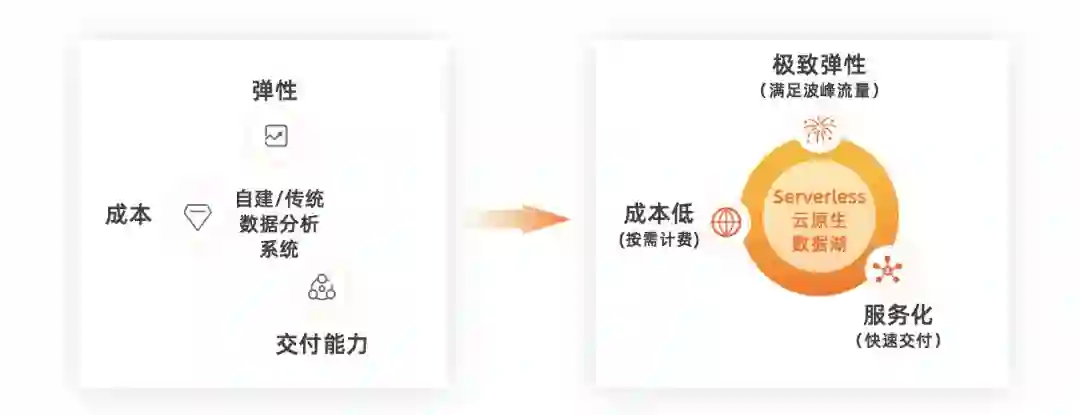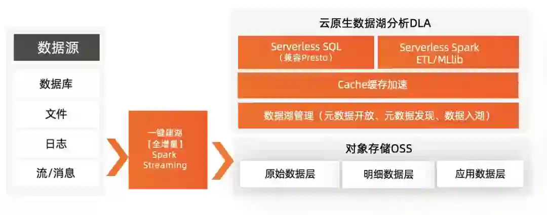 从2018年起,阿里云就开始布局数据湖,推出了云原生数据湖分析Data Lake Analytics(简称:DLA)产品,结合对象存储OSS一起,从弹性扩展、按需付费、服务化等方面打造有竞争力的产品。通过采用存储计算分离模式,存储和计算完全按需付费,用户只需要为实际产生价值的计算买单;DLA深度定制云原生弹性能力,实现作业级弹性,一分钟可弹300个节点。云原生数据湖分析DLA从成本、弹性、交付能力方面相对传统数据分析方案,获得了较大的提升。