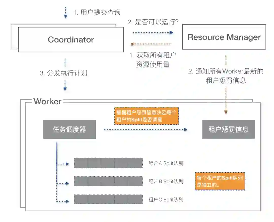 我们在集群中引入了一个ResourceManager的模块用于从所有的Coordinator收集所有租户的资源使用信息,ResourceManager把收集到的资源使用信息跟我们预设的计算力的阈值进行对比,计算出哪些租户应该被惩罚,然后把这个惩罚信息通知到所有的Worker。Worker在进行调度的时候会参照ResourceManager通知过来的惩罚信息决定哪些租户的查询得到调度,哪些租户的查询不进行调度。这样不同的租户之间算力就会得到隔离,我们测试了如果有一个租户过量使用资源,它会在最长1.3秒之内得到惩罚,从而释放资源给其它租户,而社区默认版本的“惩罚”要等到租户所有的查询执行完成才会到来。只有元数据和计算力得到隔离,我们才能放心用一个集群来服务我们所有的用户。
