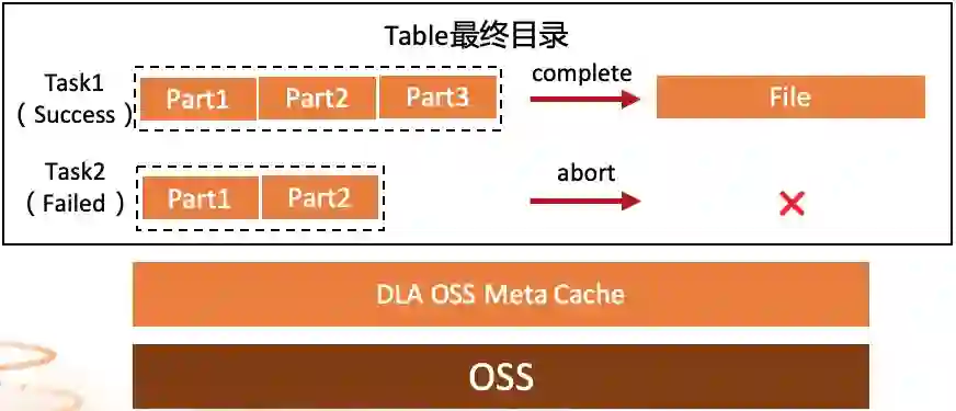 针对Spark访问OSS的特点,我们全新实现了Hadoop FileOutputFormat接口,如上图所示。算法的改进重点在优化合并操作,合并的核心是解决文件何时可见的问题。OSS提供MultipartUpload接口,也就是断点续传功能,文件可以分片上传,上传没有结束,分片文件是不可见的。借助该特性,我们可以让Task直接将数据写入到最终目录,只有作业成功才让文件最终可见,该方法不用先写入临时目录,也就大大减少了元数据的操作。对于执行失败的Task写入的临时分片,我们在作业结束时,执行Abort操作,就可以将其删除,这也就降低了空间占用。