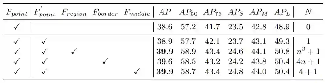 我们发现,提取边界的中心点的特征,能够达到和region feature同样的结果,且采样点个数少了很多。这意味着只需要更少的复杂度,能够高效的提取到有用的特征。且同时证明了,边界极限点特征对物体定位确实有非常重要的作用。