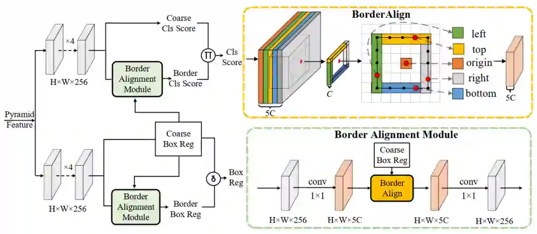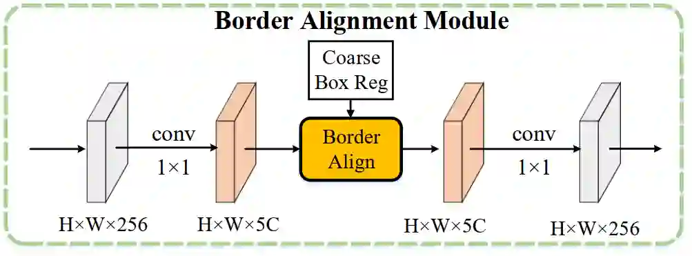 对于来自于FPN的特征,borderAlign需要5xC的border-sensitive的特征图,所以需要将通道先升维,提取完后再降维。为了“最干净”的验证Border feature的有效性,BAM中使用1x1conv来做升降维,几乎不增加模型的计算量。最后还原到256通道,来做最终的边界的分类和回归。