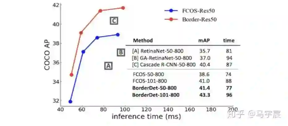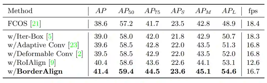我们提出了一种非常简单、高效的操作来提取物体边界极限点的特征,叫做“BorderAlign”。模型只增加很少的时间开销,可以在经典模型上FCOS(38.6 v.s. 41.4). FPN(37.1 v.s. 40.7)。下面是我们的方法和这些经典模型的对比。