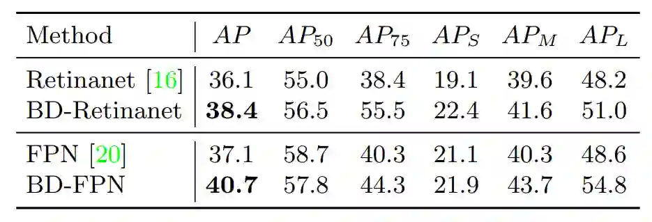 在Retinanet上有2.3的提升、FPN上有3.6的提升,在不同模型上均有不俗的表现。