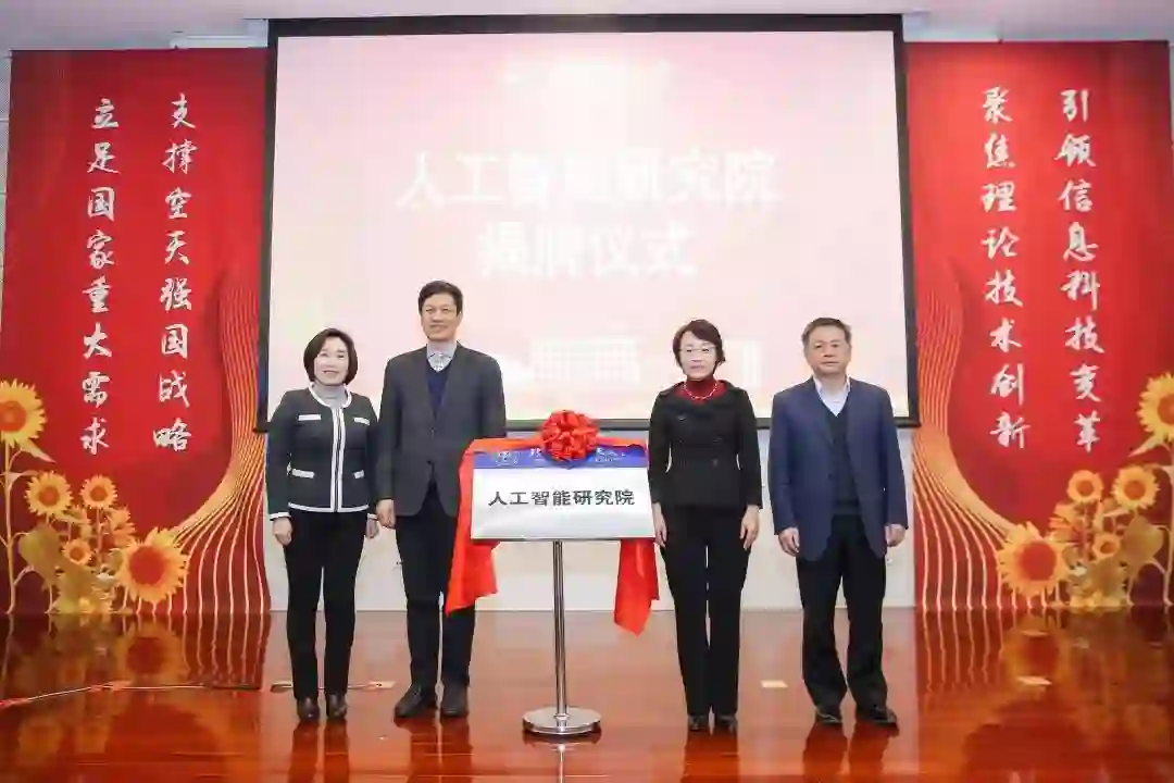 校党委书记曹淑敏、校长徐惠彬,人工智能研究院院长郑志明、党委书记金蓉为研究院揭牌。从左到右依次为金蓉、徐惠彬、曹淑敏和郑志明。
