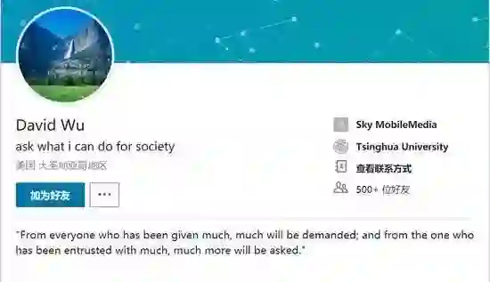 在他的领英主页上,姓名下方写的是“问问自己能为社会做些什么”,签名栏则引用了《圣经》中的一段文字作为自勉: