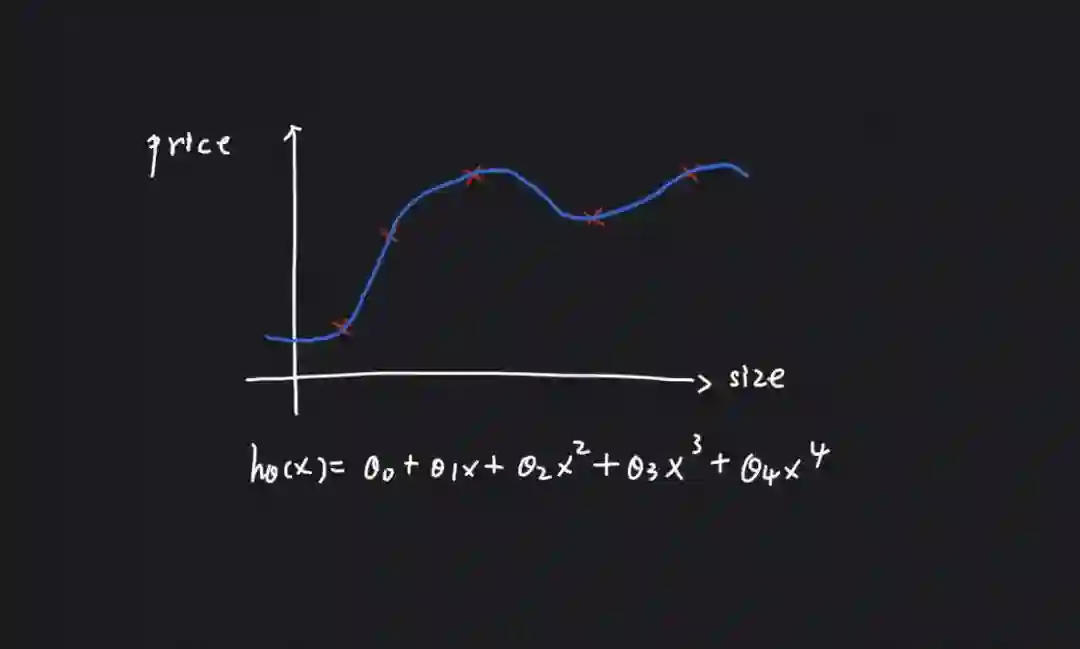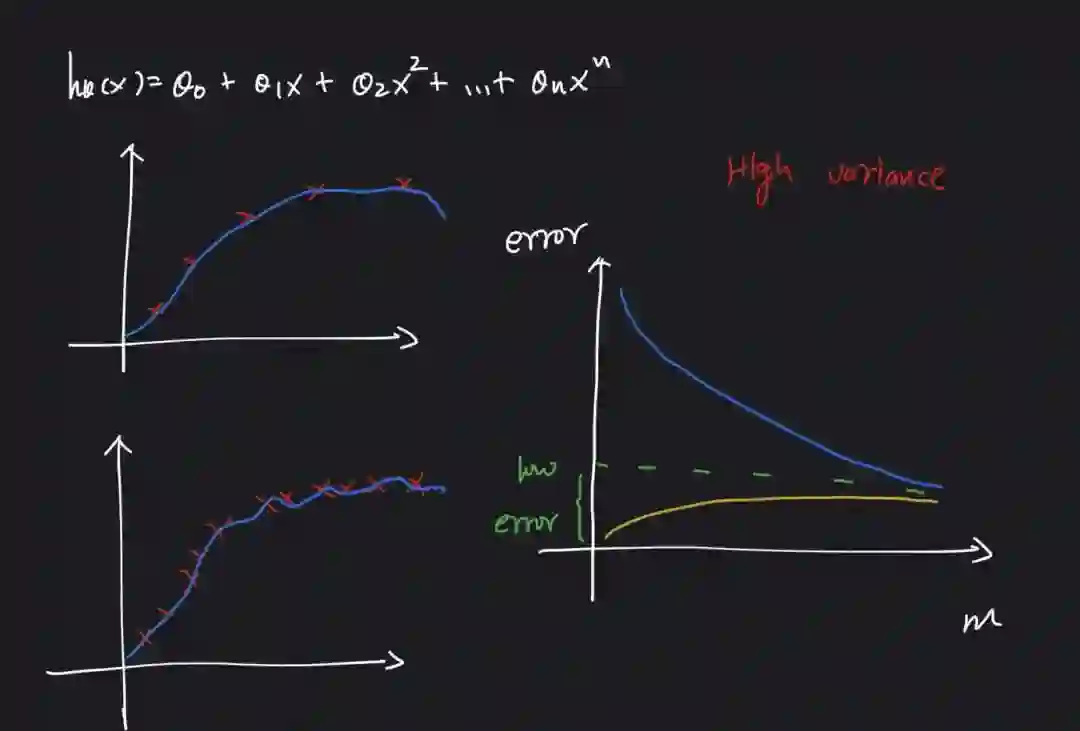 但是当我们继续增大模型的多项式次数后,会发现训练集误差继续减少,但是交叉验证误差却反而增大了,这是因为我们选择的多项式次数太高,模型在交叉验证集上产生了过拟合,也即方差太大。