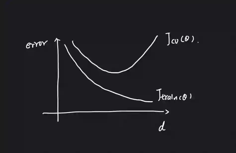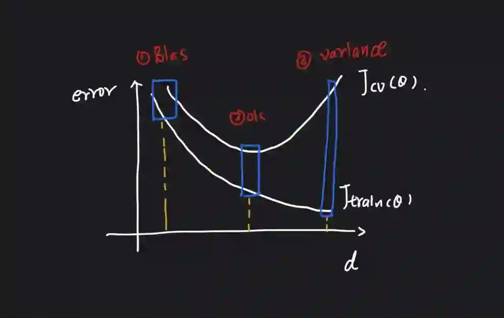 当我们选择一个合适的模型时,训练集和交叉验证集的误差都比较小,并且交叉验证集的误差处于最低点,这说明当前多项式次数对应的模型拟合交叉验证集的效果最好。