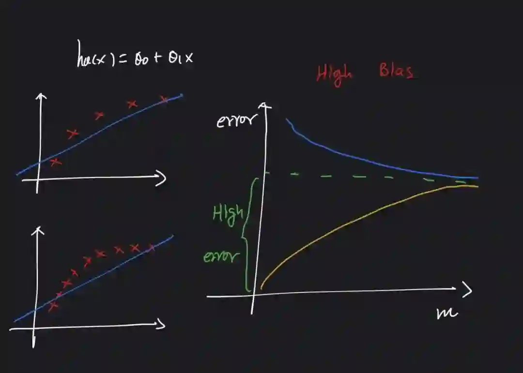 当模型欠拟合时,比如多项式次数太少(特征太少了),不管把样本数量增大到多少,训练集误差和交叉验证集误差都不会下降很多,这种情况就说明我们的模型存在高偏差问题,也就是欠拟合了: