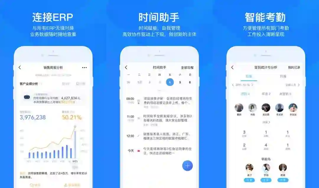 你可以把它当做时间助手,还有连接ERP 的报表。同时文件管理,审批,签到等功能。