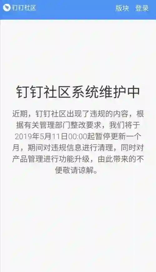 原文如下:近期,钉钉社区出现了违规的内容,根据有关管理部门整改要求,我们将于2019年5月11日00:00起暂停更新一个月,整改期间对违规信息进行清理,同时对产品管理进行功能升级,由此带来的不便,敬请谅解。
