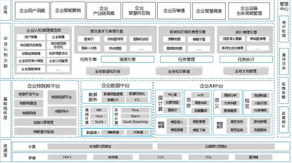 企业认知大脑帮助企业实现认知与决策的数字化及智能化,进而实现企业的生态协同。企业认知大脑是面向企业数据智能需求的综合解决方案,整体框架如图4所示,它如同设备认知大脑,是建设在由企业物联网平台、企业数据中台及企业AI中台构成的基础组件层之上的。
