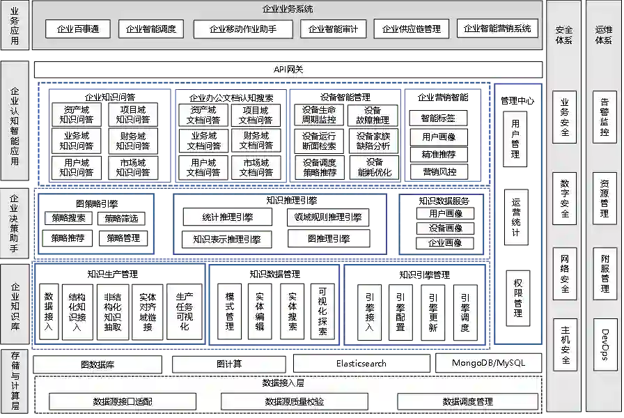 在知识与数据方面,企业认知大脑是企业的知识中台,将数据聚合并转化为体系统一的企业全域知识图谱,并提供统一标准的知识服务。