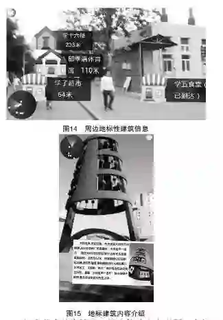 实验者被分为两组,A组中的17名使用者在试用软件前,由培训人员介绍软件开发的背景和各项功能,确认实验对象能够独立使用该软件,并在使用后填写问卷。B组的17名使用者在软件试用之前并没有接受培训人员对软件开发背景和各项功能的讲解,由使用者自行安装软件试用并在试用结束后填写问卷。两组使用者试用系统平台2-3 个小时。使用过程中用户可以根据摄像头中捕获到的真实场景去寻找校园相关地标性建筑,如右图14。在到达地标性建筑后,摄像头通过捕获图像自动识别出地标信息,并作为学习内容呈现给用户,如右图15所示。