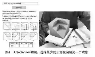 Mart í n-Gutié rrez, Lu í s Saorí n, Contero, Alcañiz, Pérez-López and Ortega[8]展示了一项帮助工科学生提高空间能力的增强现实应用。如图4所示,他们设计了一本可以呈现3D模型的书籍AR-Dehaes来帮助学生完成虚拟化的任务,试图在一个短期的补习课程内提高他们的空间技能。一个由24名大学新生参与的验证性实验证实了该训练在提高学生空间能力上具有可测量的积极效果。