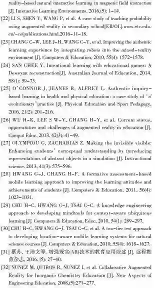 Cai, Chiang, Sun, Lin and Lee[21]还将AR技术与微软Kinect体感交互技术相结合。研究表明,基于AR 的体感教学软件能够帮助学生理解磁场和磁感线等抽象的概念,有助于学生更高效地学习物理规律。同时,AR技术不仅在提高学习成绩上成效显著, 在改善学生的学习兴趣方面亦有不错的效果。