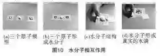 如图 10-(a)所示,屏幕中放入了2个氢原子和1个氧原子。当慢慢将这两个氢原子向氧原子靠近时,一个水分子便形成了,如图 10-(b)所示。用户可以拿起水分子靠近摄像头来观察它的结构,若将标签向上抬高,即可看到屏幕出现一滴水滴,如图 10-(c)和图 10-(d)所示。