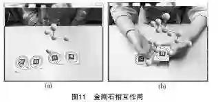 该软件使用Java语言开发,使用了NyArToolkit,Java3D 以及JMF(Java Media Framework)软件包。通过捕获标签的位置来呈现不同的结构层次以及原子的各种组合。如图10 和下页图11展示了水和钻石两个实例的操作。