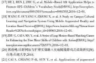 He, Ren, Zhu, Cai and Chen[17]设计了一个移动设备上的应用“快乐记单词”。通过手机或者平板上的摄像头扫描单词,屏幕呈现出相应的三维模型并发出语音。结果表明这种方式能更好地提高儿童对学习英语单词拼写和朗读的兴趣,并能提升学习效果。