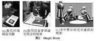在教育领域里最早运用增强现实技术的案例是Billinghurst制作的Magic Book[3]。它根据书本内容制作成3D场景和动画,并且利用一个特殊的眼镜就能让儿童看到虚实结合的场景,如图2所示。这幅图也生动地展示了图 1中的从完全真实环境到完全虚拟场景的连接关系。