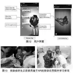 如图12所示为AR应用软件的用户界面。欢迎界面包括“开始取词”“关于作者”“退出程序”三个按钮。点击“开始取词”即可进入“取词页面”;将手机摄像头对准单词卡片,即可显示对应的单词图片,点击图片会播放该单词的发音。学习者需要在获取单词后,将其与出现的图片连接,在点击单词后,听取发音并重复。如图13所示为实验组学生正在使用基于AR的移动应用程序学习单词。