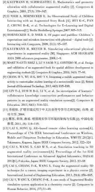 Cai, Wang, Gao and Yu[14]设计了本地和网络在线两种形式进行仿真教学的平台。在增强现实学习环境中,由于用户抛弃了鼠标、键盘而使用自然交互方式,因此与真实的环境中操作真实物理器具的感受一致。进一步来说,这种虚实融合的环境使得因一些成本、安全受限制,或者现实中根本无法实现的场景叠加到真实环境中,让学习者体验到了一种新颖、有趣而又不产生操作隔膜感的学习方式。