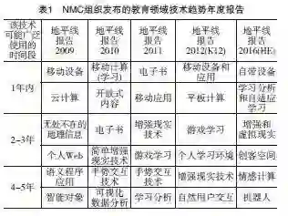 教育领域著名组织The New Media Consortium(NMC) 近几年发布的地平线报告中将增强现实技术列为未来几年最具潜力的六个技术之一,如表1所示。从 “简单增强现实技术”到“增强现实技术”的字眼变化可以看出这门技术正在迅速走向成熟应用。