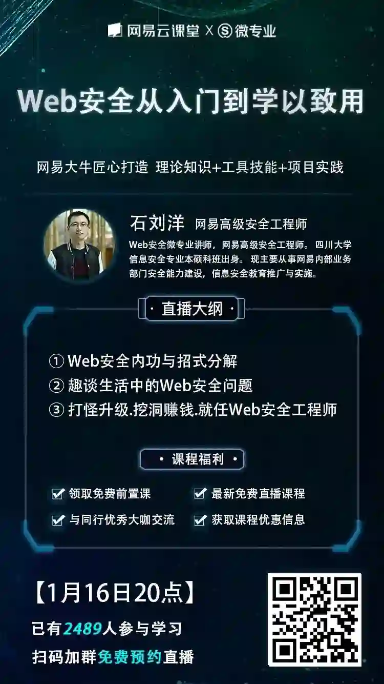 为了让大家更进一步了解 Web 安全的学习路径以及企业对安全人才的实际需求,1月16日晚上20点,我们邀请到 网易高级安全工程师石刘洋 在网易云课堂进行一场主题为《Web 安全从入门到学以致用》的免费的直播分享。