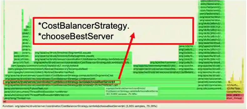 通过火焰图对 Coordinator 进行 Profiling 最终定位了问题,如下图所示,将最耗时部分放大出来,是负载均衡策略对每个 Segment 要选择一个最佳的服务器。阅读源码可知其过程为,加载 Segment X,需要计算它和服务器的每个 Segment Y 的代价 Cost(X,Y),其和为服务器和 Segment X 的代价。假设集群有 N 个 Segment,M 个 Historical 节点,则一个节点宕机,有 N/M 个 Segment 需要加载,每个 Segment 都和剩余的 N 个节点计算一次代价,调度耗时和 N 成平方关系。