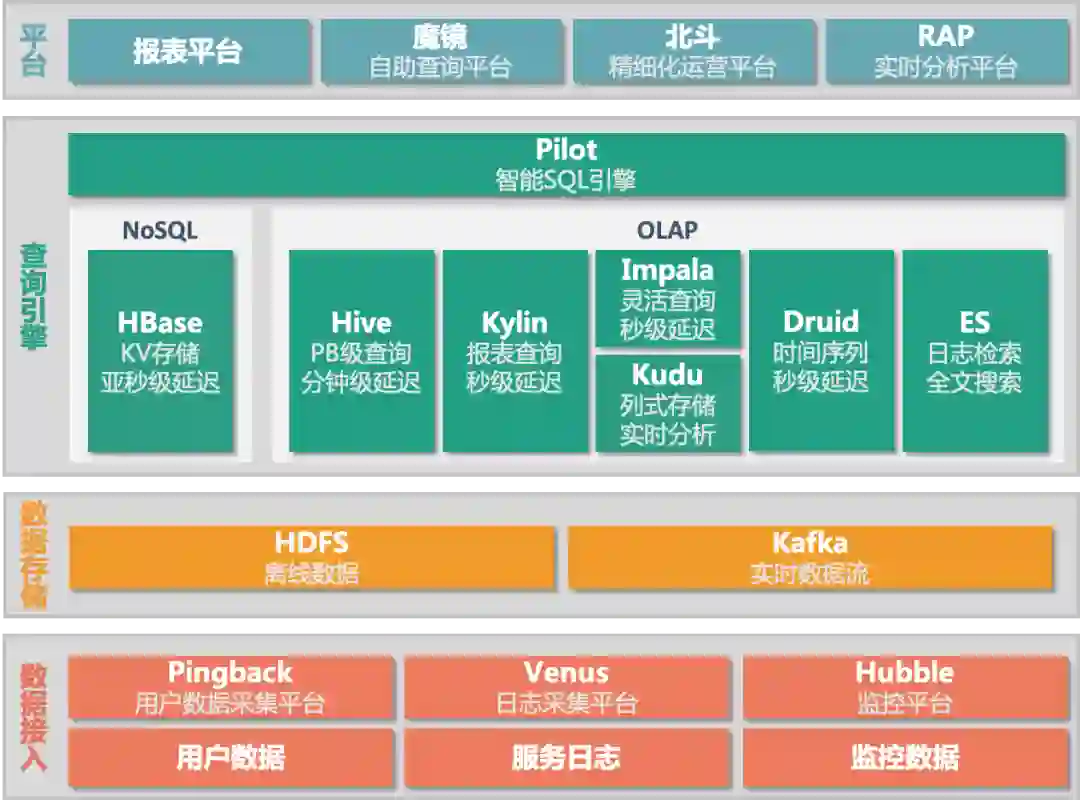 爱奇艺大数据 OLAP 服务在2015年前主要以离线分析为主,主要基于 Hive+MySQL、HBase 等。2016年起引入 Kylin 和 Impala 分别支持固定报表和 Ad-hoc 查询。2018年以来引入 Kudu 和 Druid 支持实时分析需求。