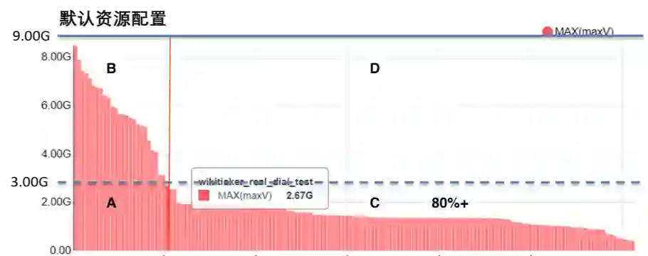 在最初,集群所有的索引任务都是统一配置,但实际使用过程中,大部分的索引任务根本达不到百万/分钟的消息量,造成了资源大量浪费。如下图所示,我们按照索引任务的内存使用量从高到低排序,9 GB 为默认配置,80%的任务利用率低于1/3,即 3 GB。我们以 3 GB 绘制一条横线,以内存使用最接近的任务绘制一条竖线,定义 A 为实际使用的内存,B 为第二象限空白部分,C 为第四象限空白部分,D 为第一象限空白部分,则浪费的资源 = ( B+C+D ) 的面积。