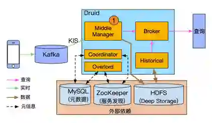Broker:查询节点,将查询分解为实时和离线部分,转发给索引节点和历史节点,并汇总最终的查询结果;